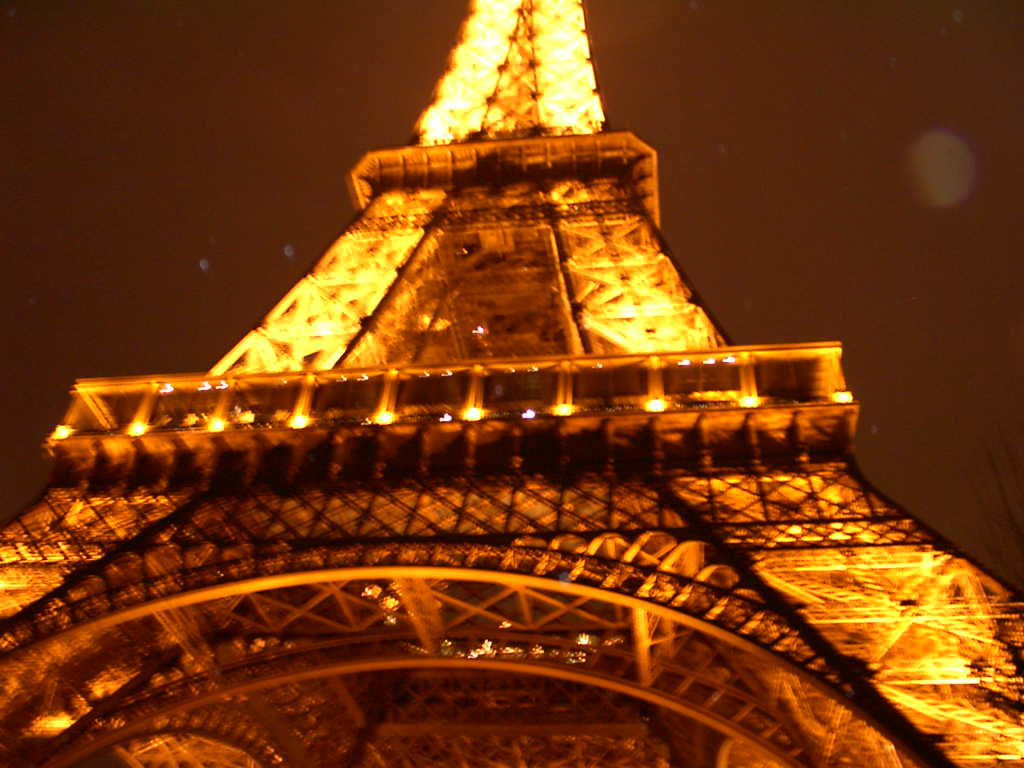 Album:Mike's trip to Paris Photo: Eiffel Tower II (6 of 51) Prev PhotoNext Photo Description: A shot looking up from near the base of the Eiffel Tower. Unfortunately, you needed a really steady hand to take nighttime pictures, so it's a little blurry...