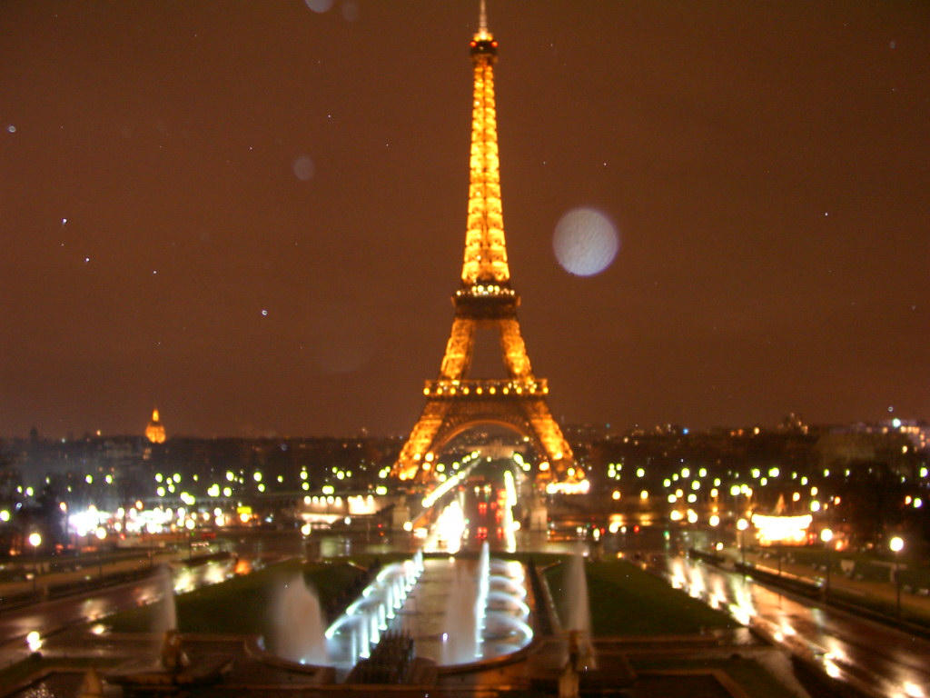 Album:Mike's trip to Paris Photo: Eiffel Tower III (9 of 51) Prev PhotoNext Photo Description: A shot back at the Eiffel Tower from the parvis du Trocadéro, a plaza between the two wings of the Palais de Chaillot. Although it would've been a really cool shot, that's not the moon, just a water drop on the lens. It was rainy!