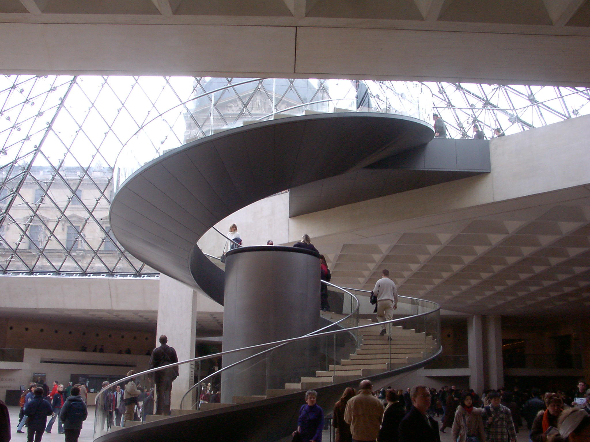 Back at the Louvre, this time inside. The cylinder at the middle of this stairwell was actually an elevetor.